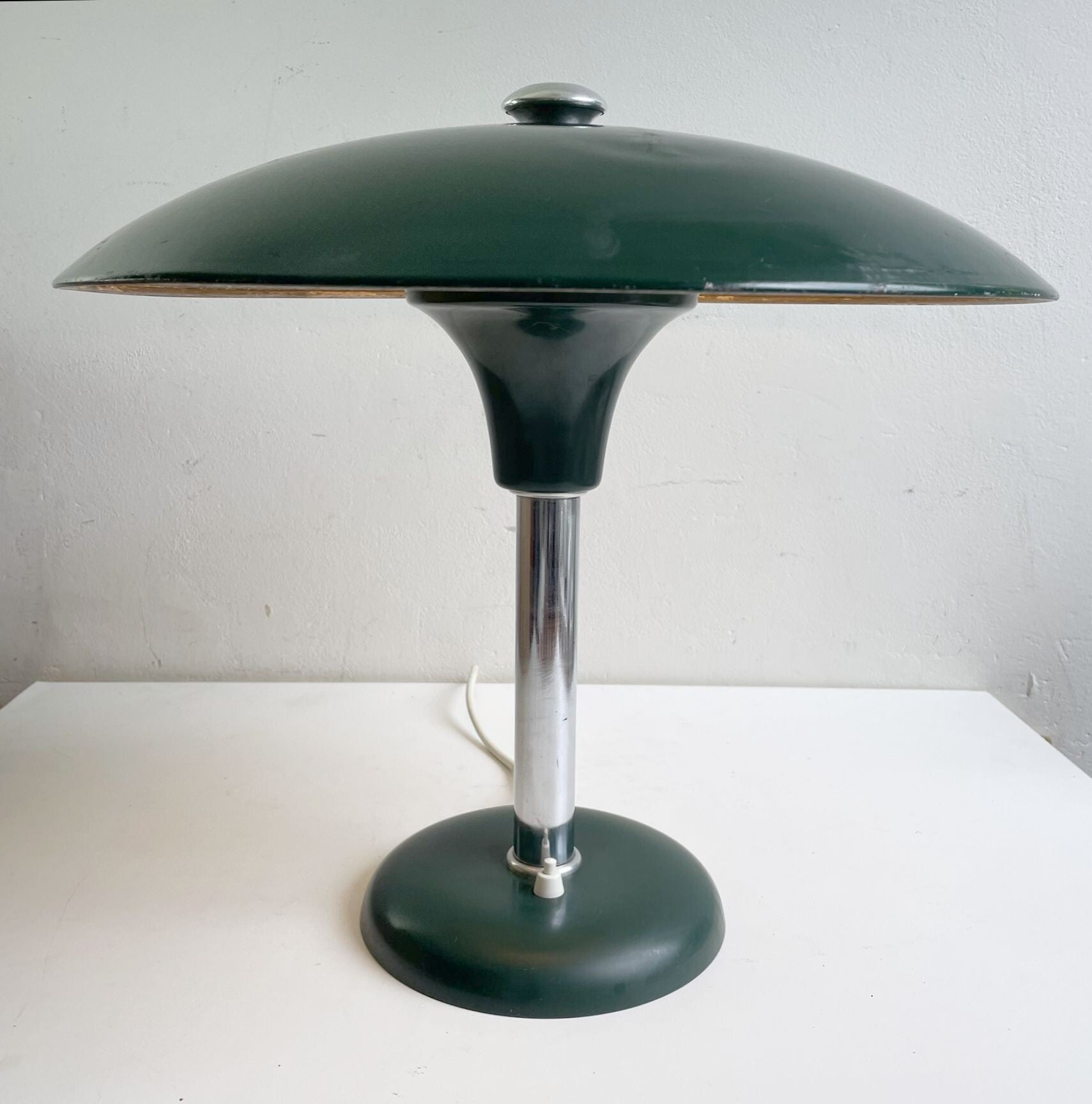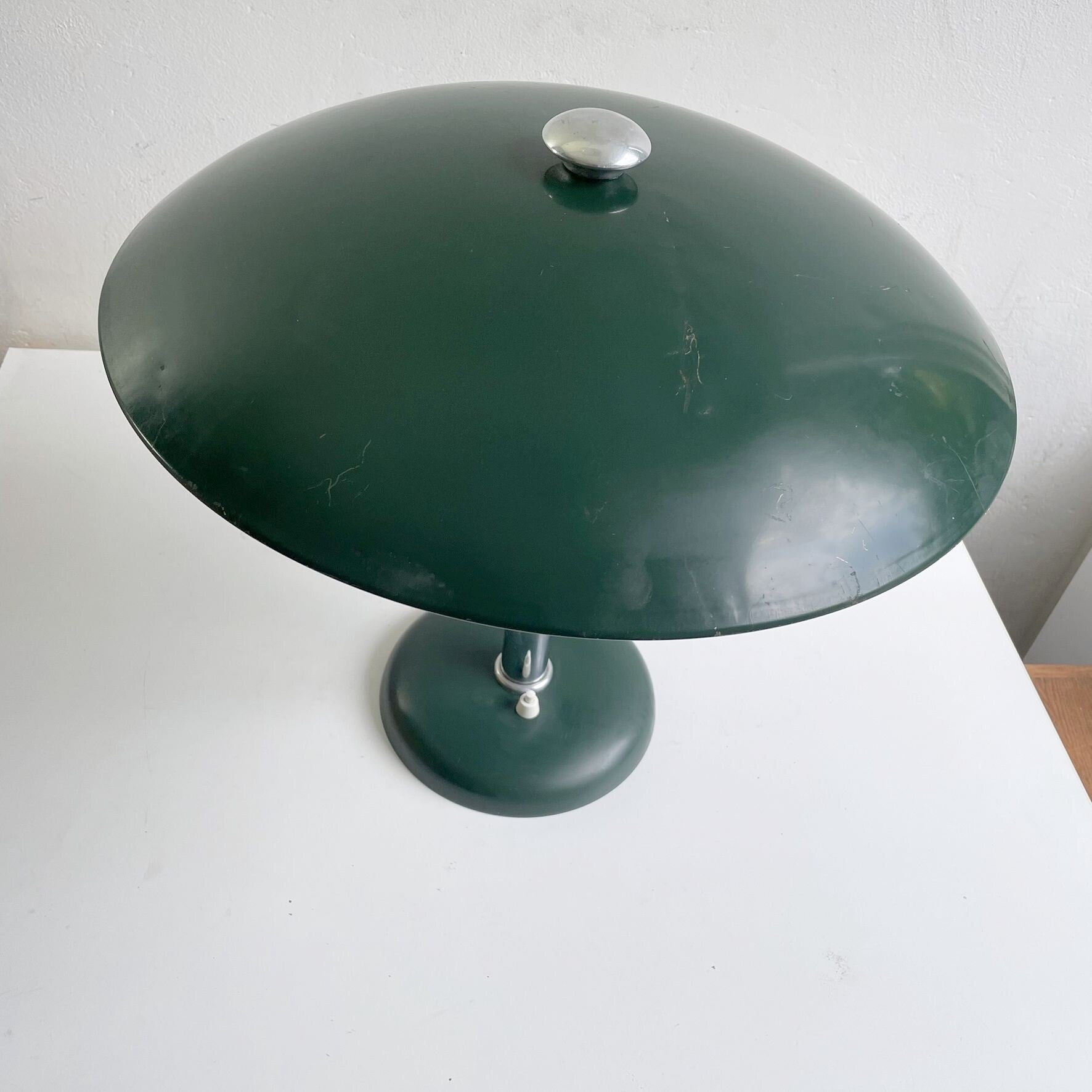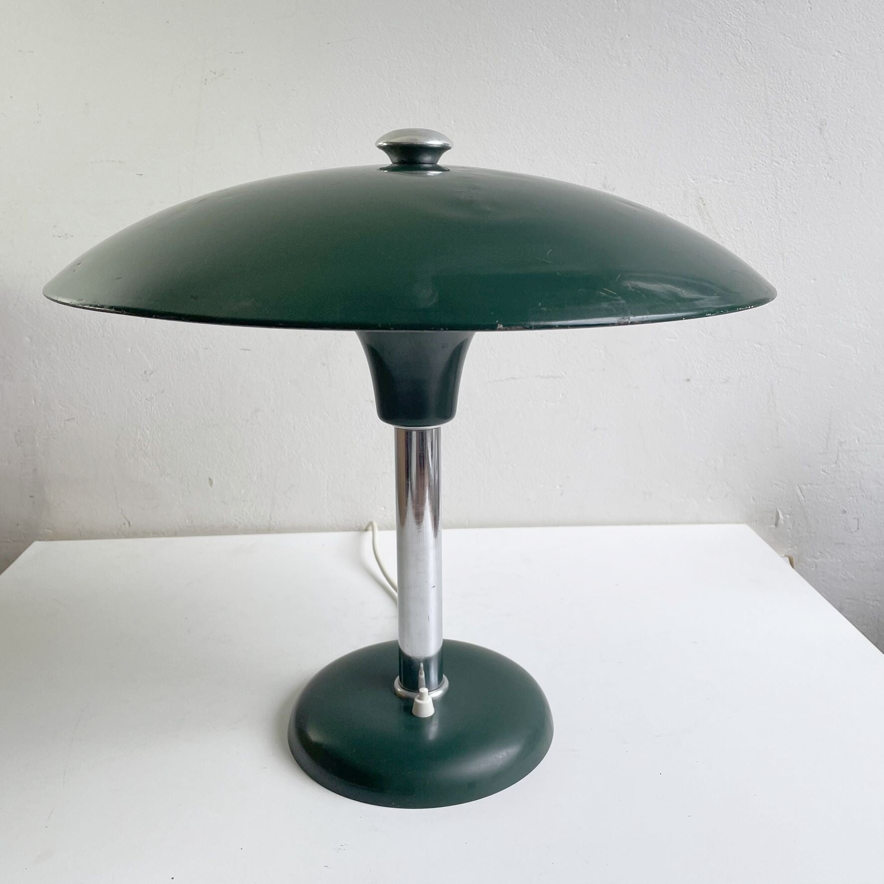 - The lamp is in good, working condition with some usage traces on the original green lacquer and a slightly dented shade, not conspicuous.