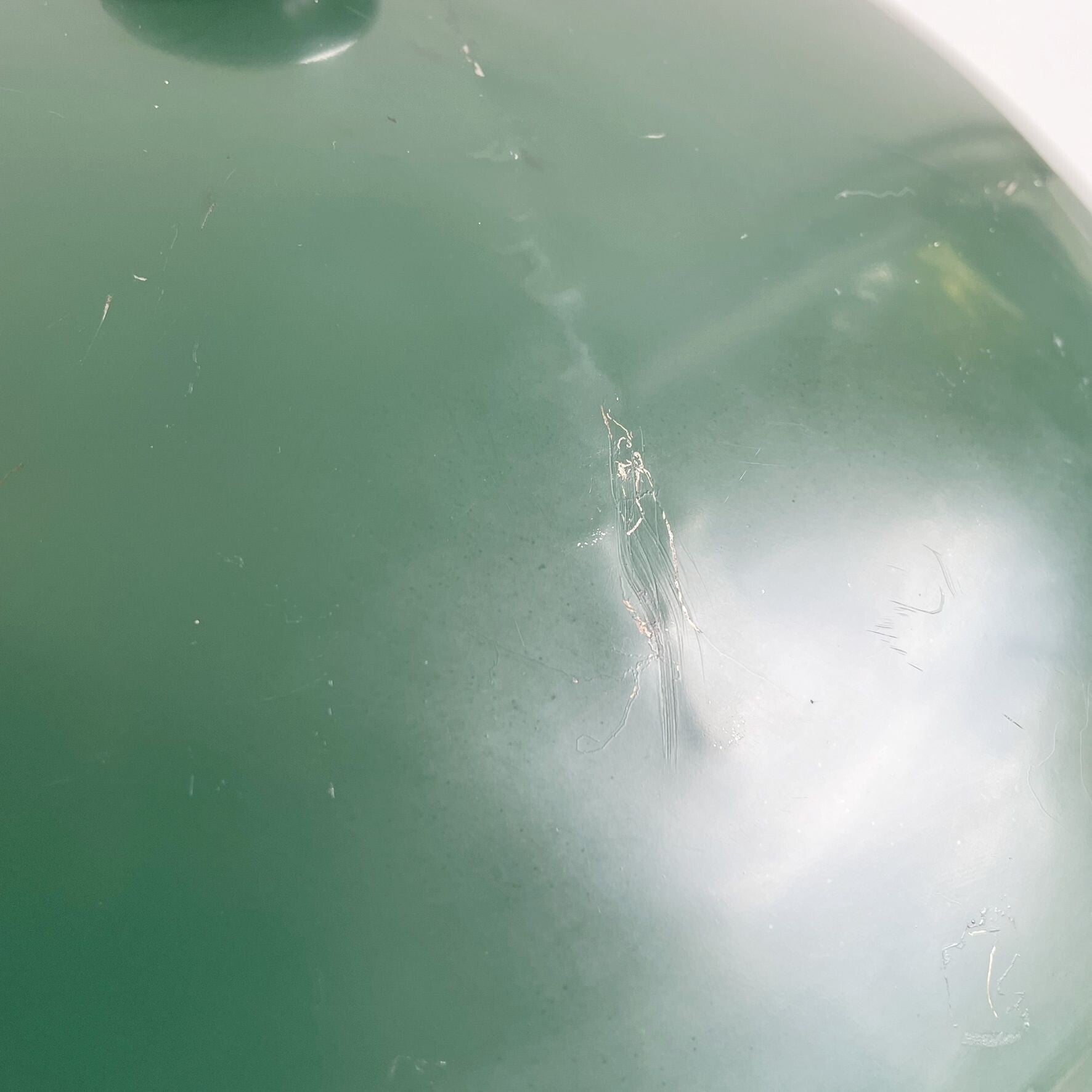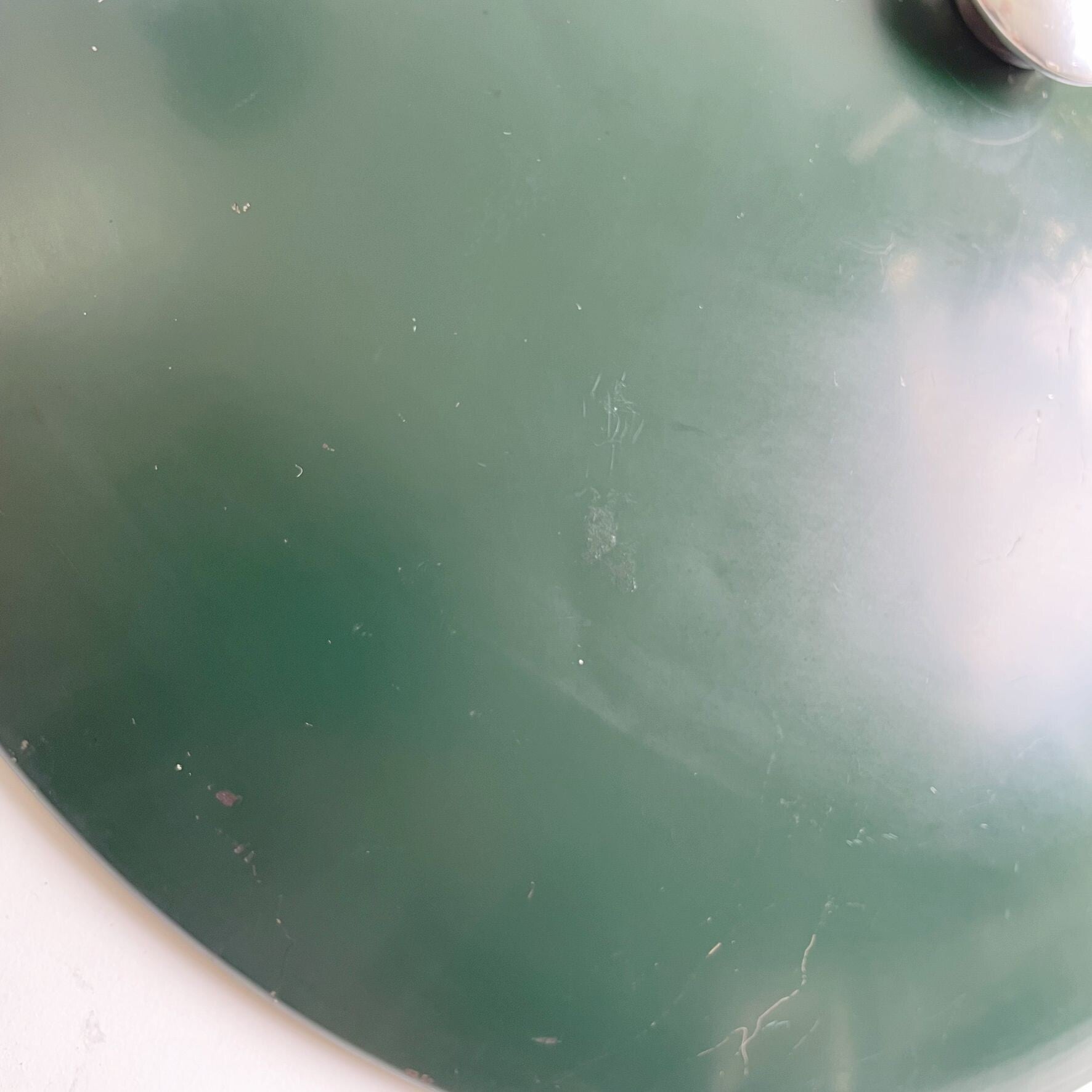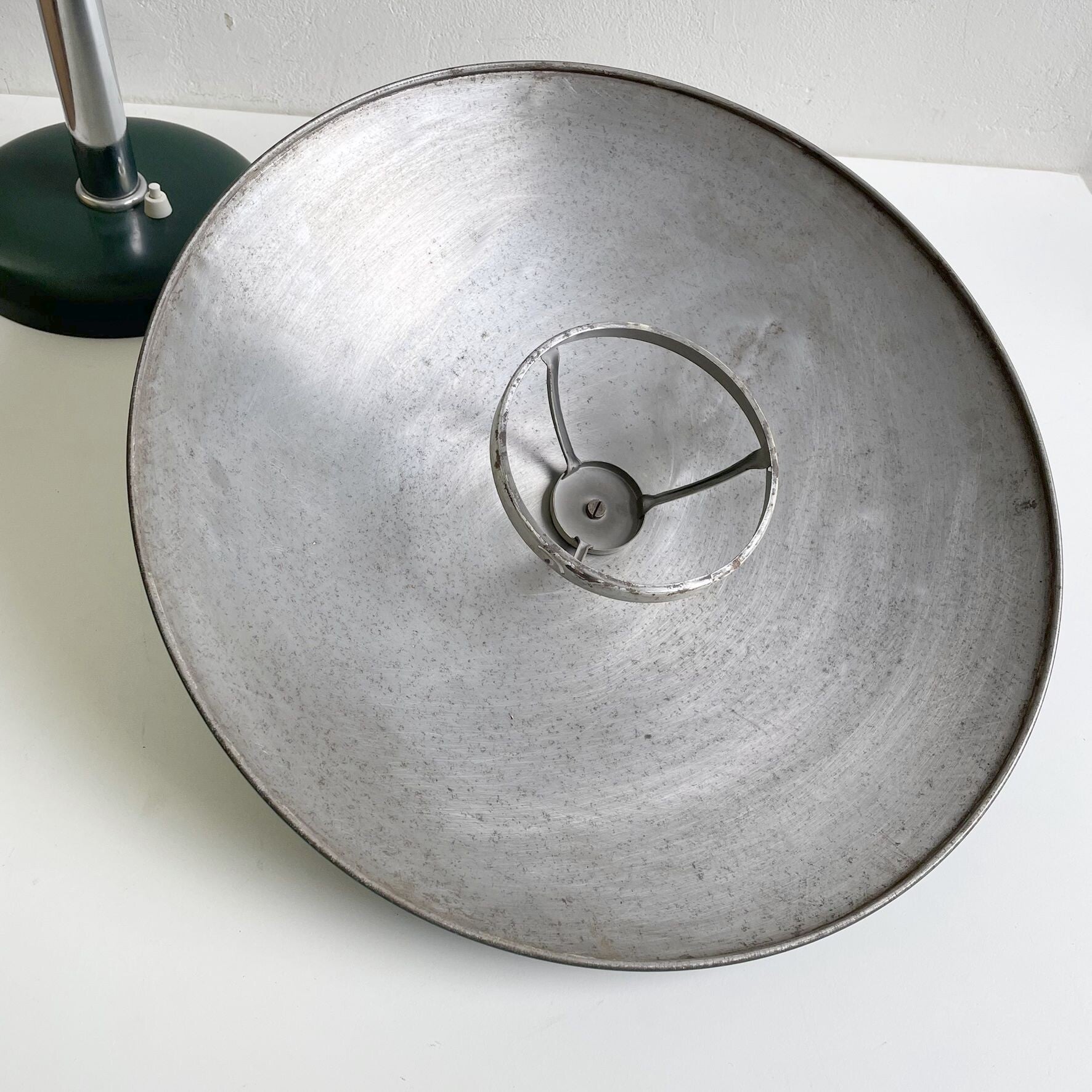 - The lamp is in good, working condition with some usage traces on the original green lacquer and a slightly dented shade, not conspicuous.